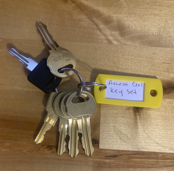 The included keys can be used to open the access control panel and unlock the protected door by manipulating electronic components inside the housing.