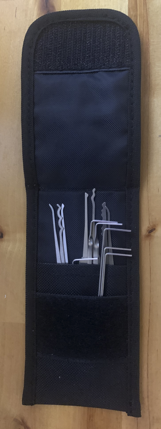 The tuxedo pick set is a small and easily concealed pouch of lock picks and tensioners.