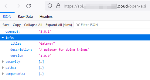 Importing API definitions into a given tool can typically be accomplished by referencing the link under the API name. In this case, the link refers to the /open-api endpoint on the server. Clicking this link will retrieve the JavaScript Object Notation (JSON) OpenAPI specification for the interface. It should look similar to the image shown below.