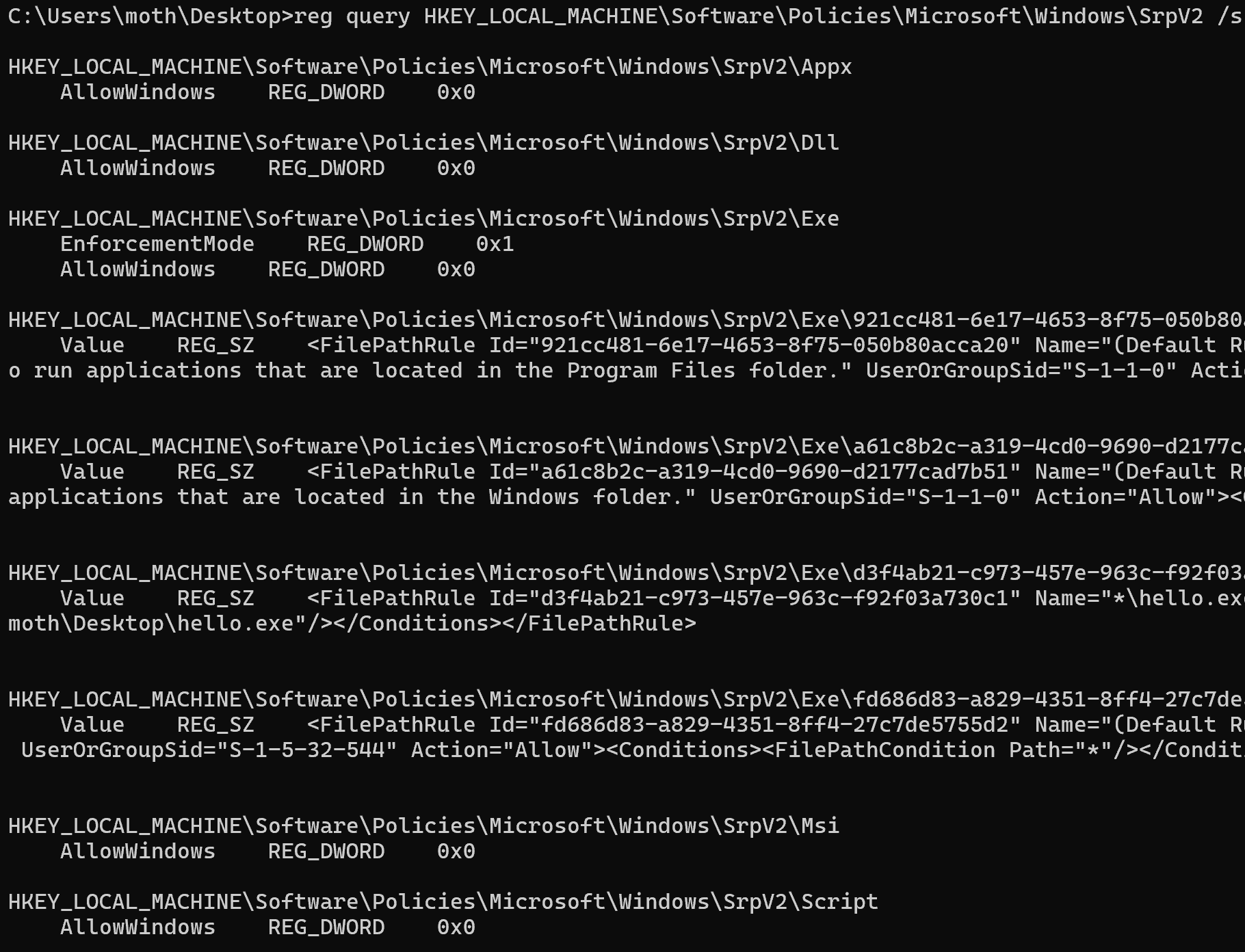 reg query HKEY_LOCAL_MACHINE\Software\Policies\Microsoft\Windows\SrpV2 /s