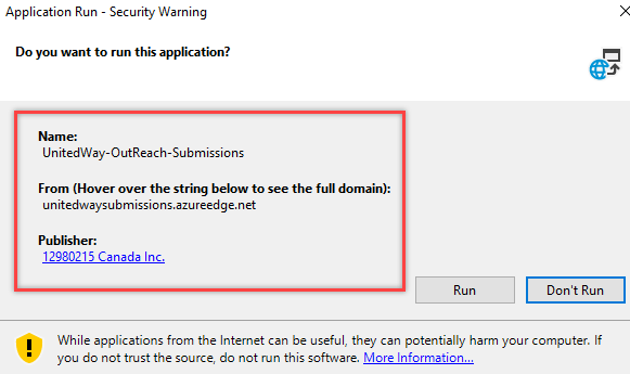 Then the last click will be to actually run the application. Please keep in mind this is with a valid Authenticode cert. EV certs will not even have this second pop up, and will be trusted by default. Invalid and Self Signed certs will have extra clicks to go through and a big red X instead of the yellow caution sign.