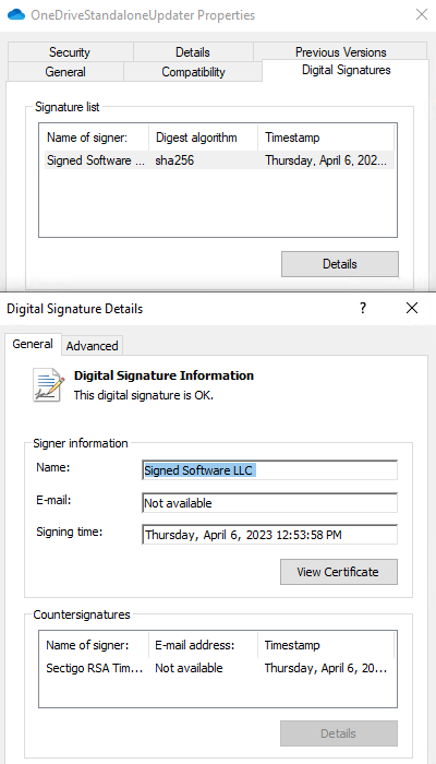 Review of the properties on the file should include the signature tab and details similar to those shown below.