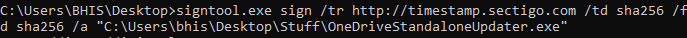 signtool.exe sign /tr http://timestamp.sectigo.com /td sha256 /fd sha256 /a "[Path to Binary]"
