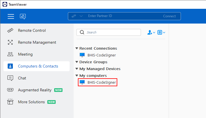 After deactivating a conflicting device, you should be able to authenticate to the TeamViewer client application successfully. Launch a session to the Signing System by clicking on the BHIS-CodeSigner entry.