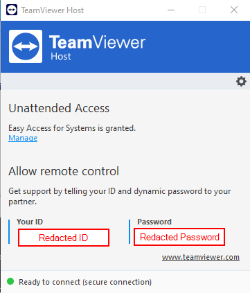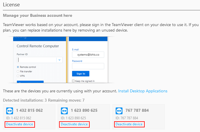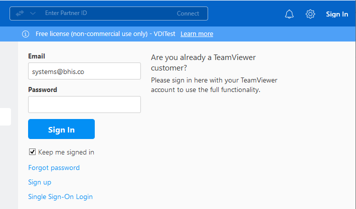Credentials for accessing the BHIS Systems TeamViewer instance can be found in the BHIS password vault (teamviewer.com). Upon first use of the TeamViewer instance, the Systems team will receive an email and have to authorize use of the license.
