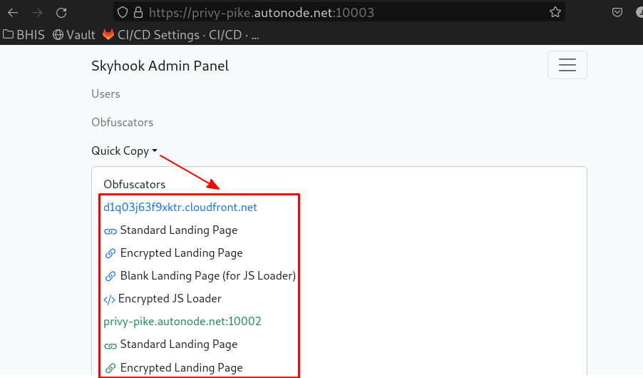 A Quick Copy button is available in the admin server’s interface. This includes a list of links, organized by FQDN, that can be copied to your clipboard for convenience.